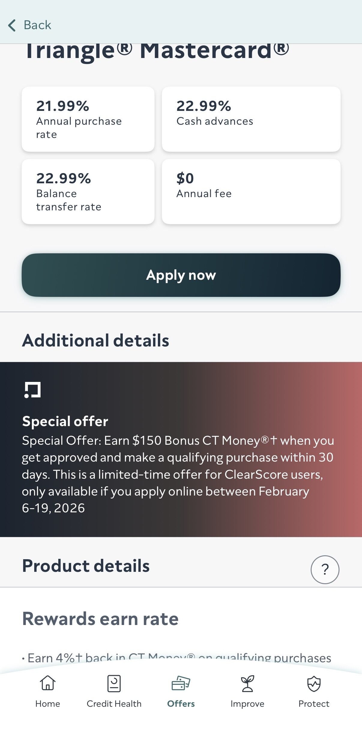 特别优惠:在获批并于30天内完成符合条件的购物后,即可获得150加元CT Money®+奖励。此限时优惠仅面向ClearScore用户,且须在2026年2月6日至19日期间在线申请方可获得。