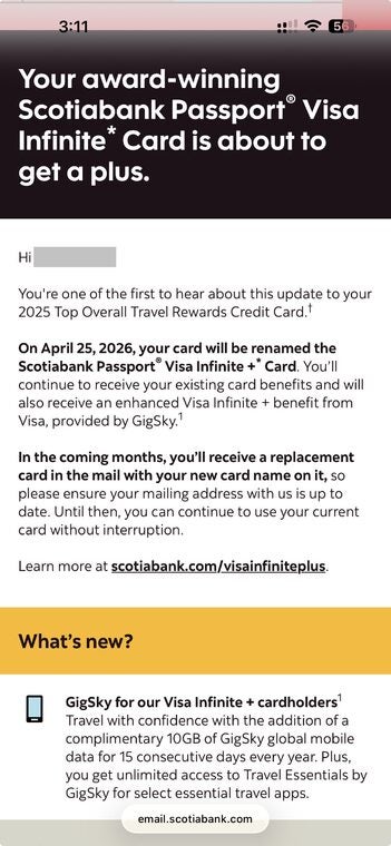 今天收到一封来自Scotiabank的电子邮件,内容是关于我的Passport Infinite卡将升级为新的“Visa Infinite+”卡。